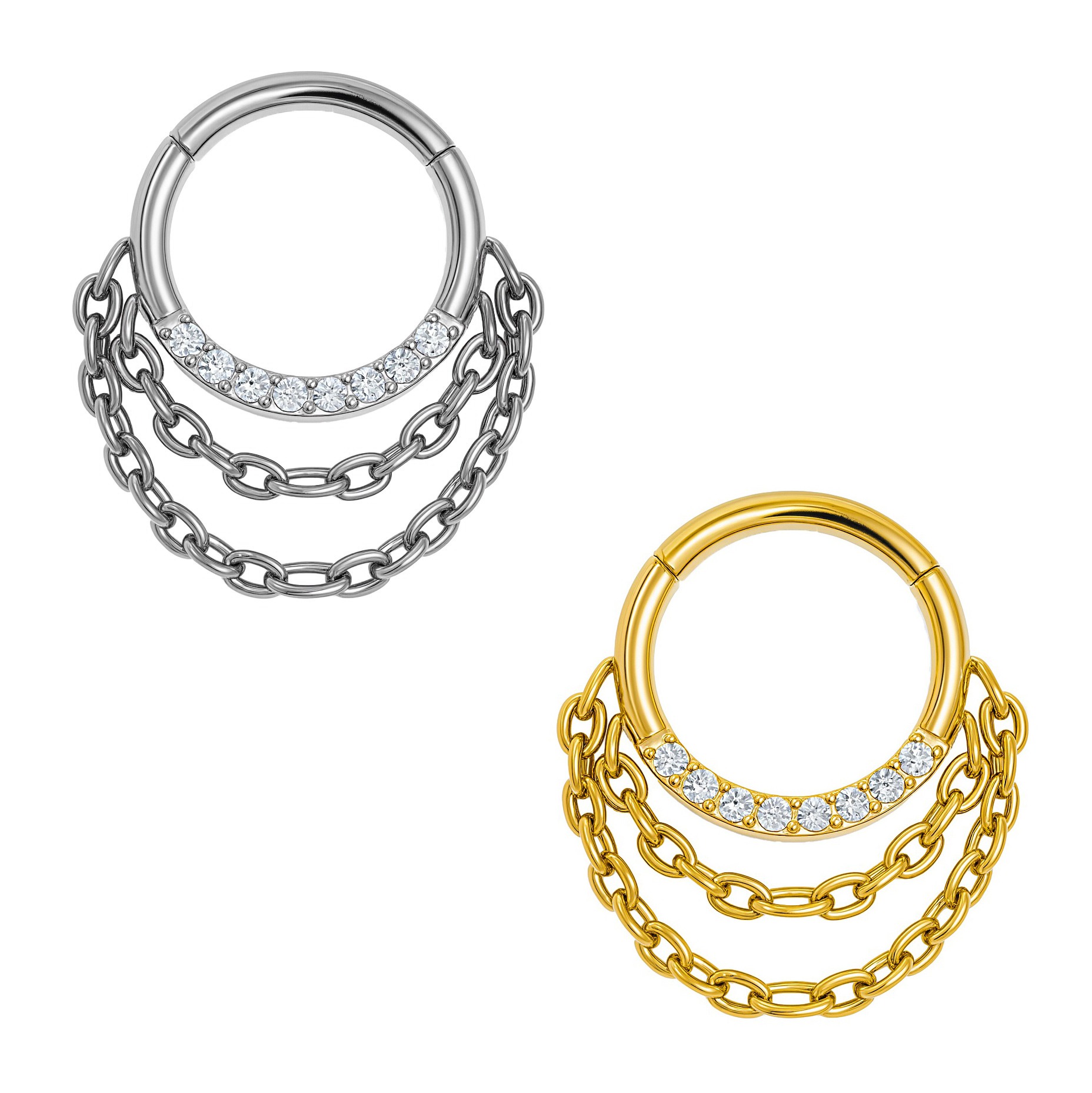 Aumente suas vendas com esta Argola Cravejada com 2 Correntes em Titânio ASTM F136! 💎 Disponível nas cores Natural e PVD Gold, este modelo é perfeito para revendedores que buscam oferecer opções elegantes e versáteis aos seus clientes. Seus clientes irão adorar a combinação de estilo e durabilidade! ✨