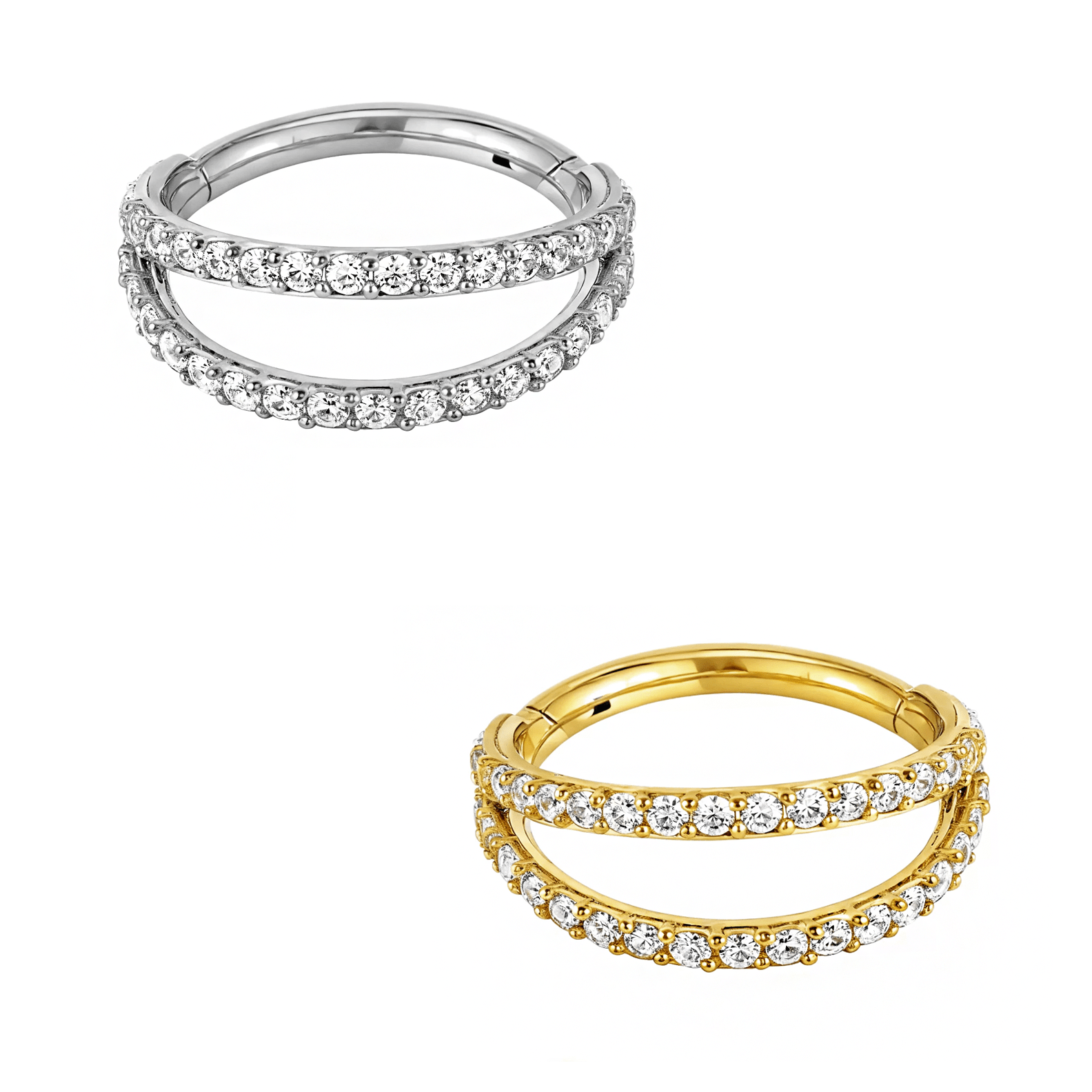 Aumente suas vendas com a Argola Double ABT Cravejada de Zircônias! 💎 Feita em Titânio ASTM F136, essa peça é perfeita para Helix e Conch, oferecendo estilo e qualidade. Seus clientes vão adorar as opções disponíveis e a durabilidade que só o titânio pode proporcionar! ✨